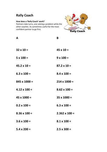 Rally coach multiplying and dividing decimals - Tes A really nice worksheet based on the topic of multiplying and dividing decimals in the style of a rally coach activity. Really like the Kagen ways of teaching and this would make an ideal activity to address this. Encourages communication and paired work too. ideal!